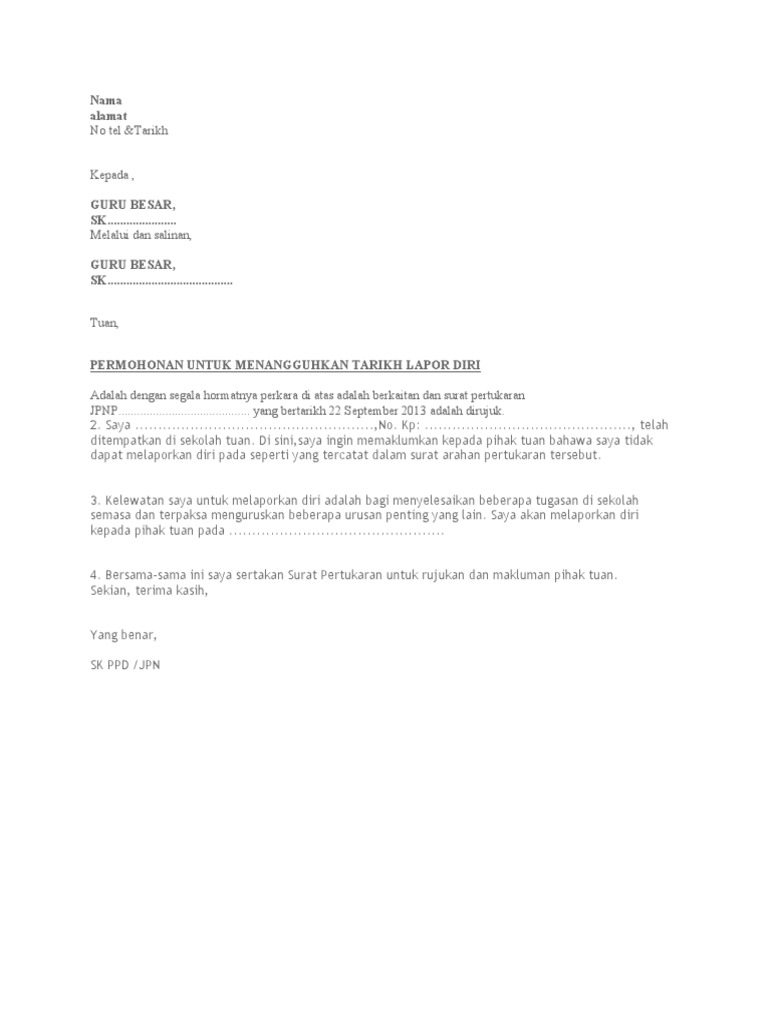 Tujuan dan manfaat surat pengunduran diri bagi anda adalah mendapatkan nilai terhormat dan profesionalitas atas pekerjaan anda selama ini pada perusahaan. Namun, tidak menutup kemungkinan dengan alasan. Namun bukan hanya karyawan, surat ini juga bisa digunakan ketika hendak keluar dari organisasi, misalnya osis. Salvaresalvați contoh surat tangguh lapor diri guru pentru mai târziu. Bagi karyawan yang akan berhenti bekerja dari perusahaan, pasti sangat membutuhkan surat ini. Tangguh bersama indonesia terhitung sejak tanggal 20 desember 2016. Dan harapannya, ia bisa tetap bekerja sampai jangka waktu yang lama bahkan hingga pensiun. Bandar no.1 sibu km 33.4 jalan oya 96000 sibu, sarawak pengetua, smk jerlun km 16 jalan putra 06150 ayer hitam kedah 9 januari 2015 puan, makluman dan permohonan penangguhan tarikh melapor diri. Dengan segala hormatnya saya diarah merujuk kepada perkara di atas dan surat bil.( ) bertarikh ( ) adalah berkaitan. Hailmi smk luar bandar no.1 sibu km 33.4 jalan oya 96000 sibu, sarawak melalui dan salinan kepada contoh surat permohonan guru ganti; Surat tugas atau yang disebut juga surat mandat merupakan surat yang isinya berupa perintah untuk mengerjakan suatu kegiatan. Namun dalam mengundurkan diri tentu saja ada prosesnya, dalam hal ini dengan cara menggunakan surat resign. Penjelasan lengkap seputar contoh surat pengunduran diri (resign) sangat cocok untuk kamu jadikan referensi.